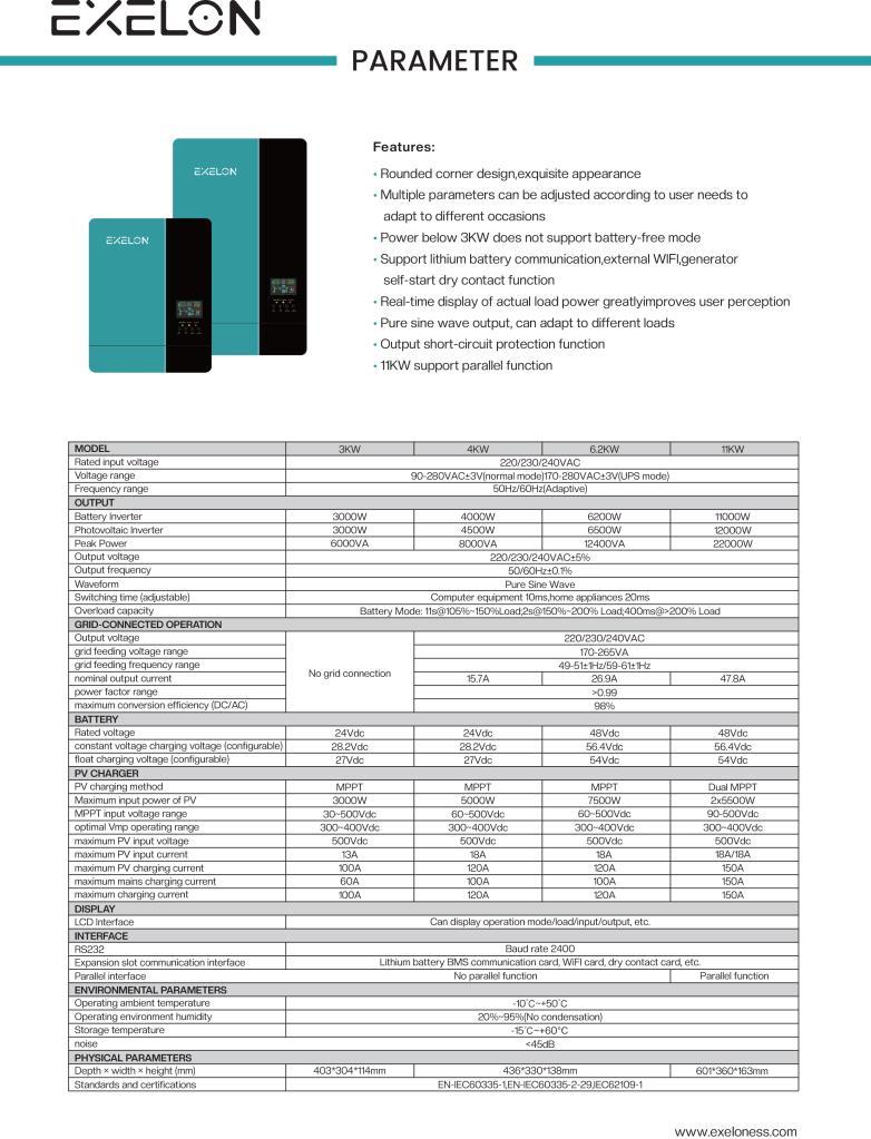 Yüksek kapasitesi, MPPT teknolojisi, gelişmiş koruma sistemleri ve akıllı enerji yönetimi sayesinde Exelon 11kW 48V inverter, güneş enerjisi sistemlerinde maksimum verim ve güvenilir performans sunar. Büyük ölçekli konut ve ticari uygulamalar için güçlü, verimli ve uzun ömürlü bir enerji çözümüdür.