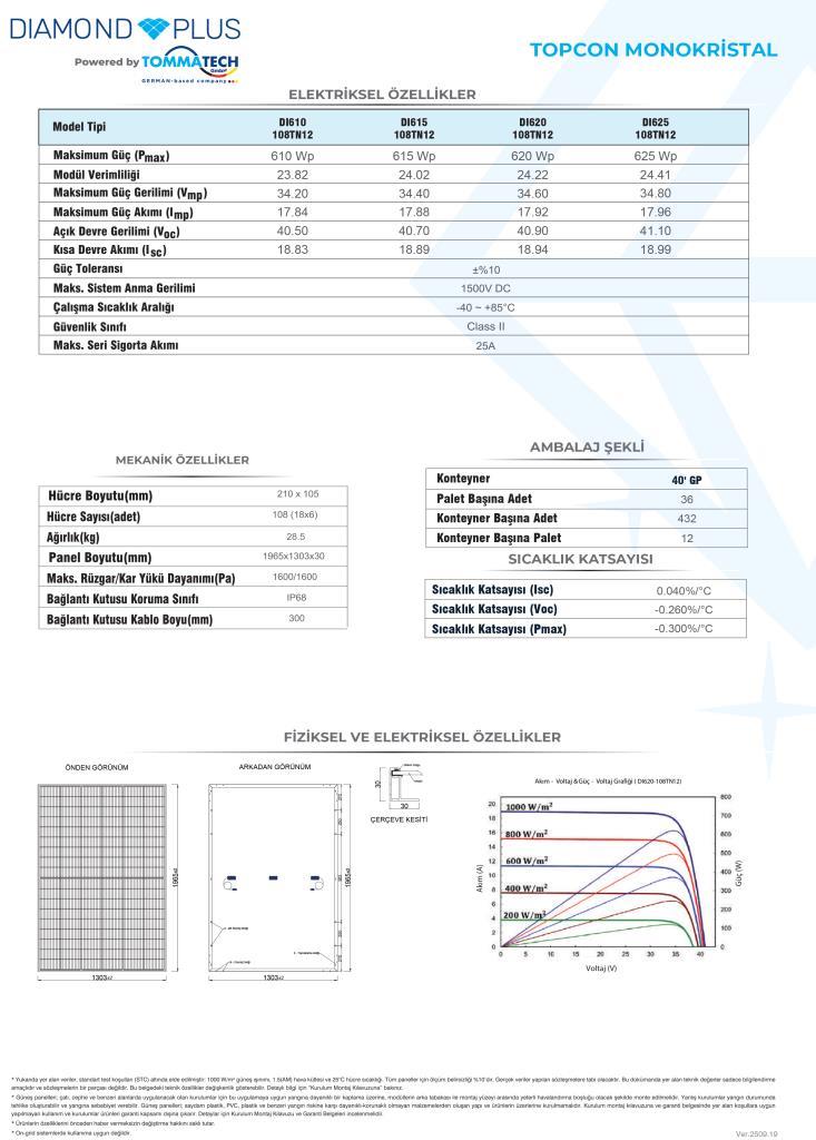 Yüksek verimlilik, gelişmiş TOPCon hücre teknolojisi ve uzun garanti süresiyle TommaTech 625Wp 108TN M12 TOPCon Diamond Plus güneş paneli, sürdürülebilir ve güçlü enerji üretimi hedefleyen projeler için ideal bir çözümdür.