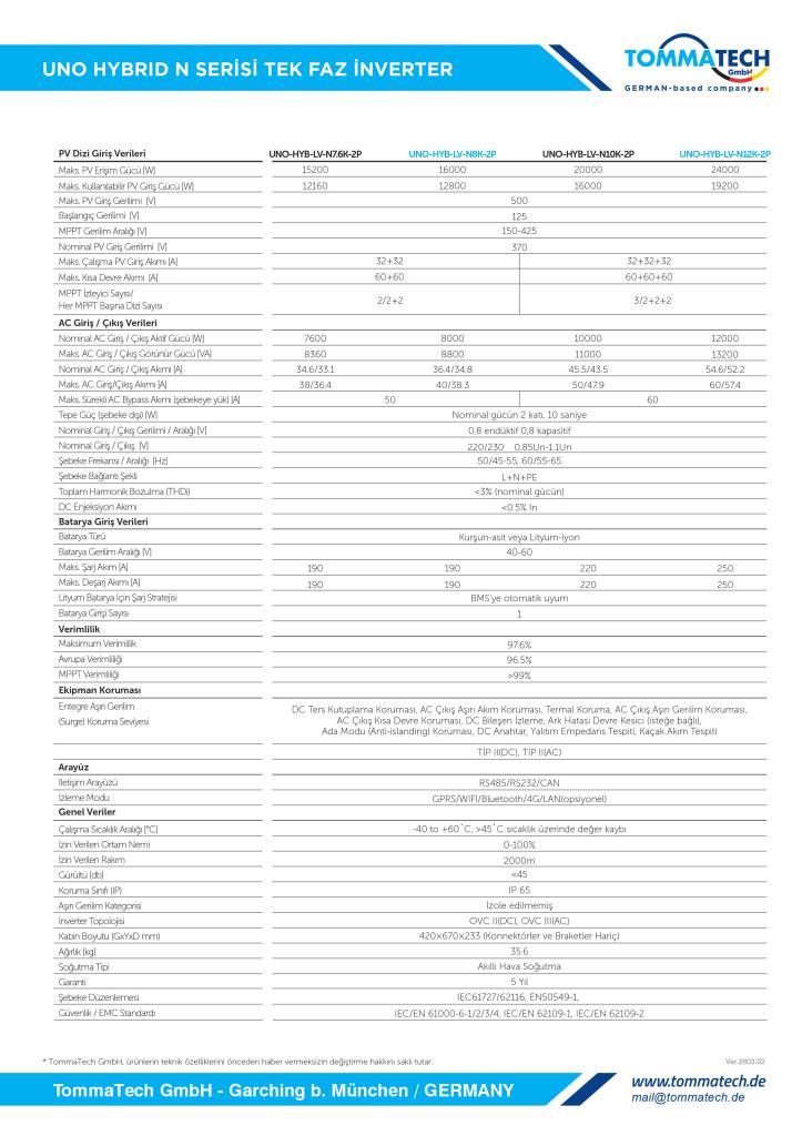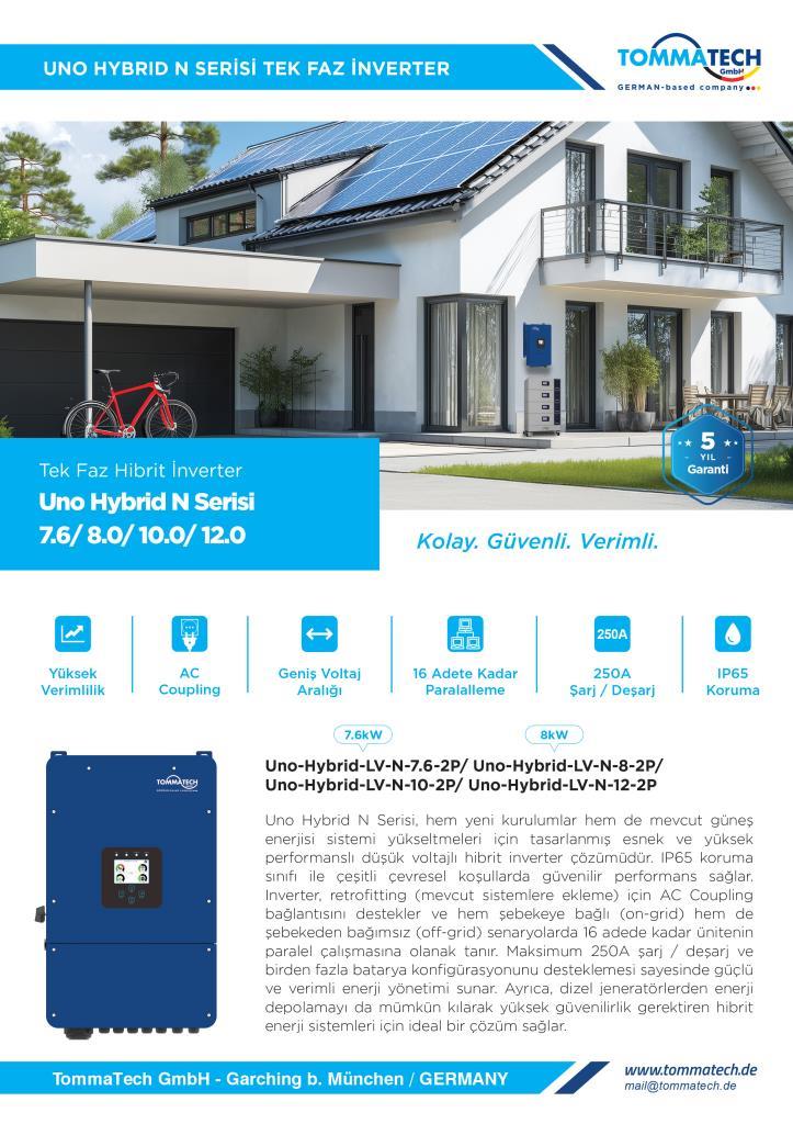 TommaTech Uno Hybrid N 12.0kW Tek Faz İnverter, ev tipi güneş enerjisi sistemleri, küçük işletmeler, şebeke bağlantılı hibrit sistemler ve kesintisiz enerji ihtiyacı olan mekanlar için uygundur. Hem güneşten hem bataryadan hem de şebekeden enerji sağlayabilme özelliği ile maksimum esneklik sunar.