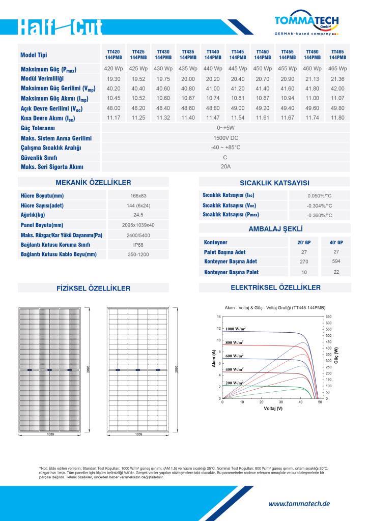 TommaTech 450Wp Bifacial Panel, çatı sistemleri, sanayi ve ticari güneş enerji projeleri ile off-grid sistemler için uygundur. Bifacial ve Half-Cut teknolojisi, gölgeli ve düşük ışıklı koşullarda bile yüksek verim sağlar.