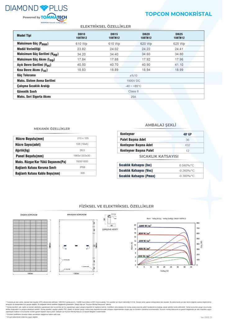 TommaTech 625Wp M12 108TN Diamond Plus Güneş Paneli – 31 Adet (1 Palet)