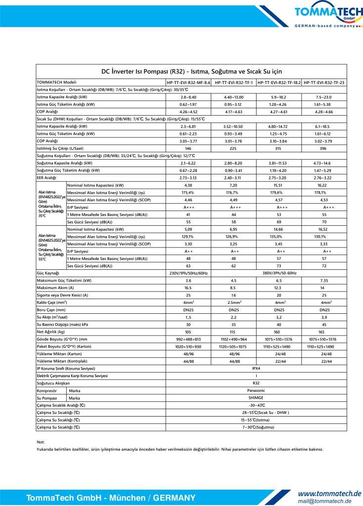 Yüksek verimli inverter teknolojisi, çevre dostu R32 gaz, akıllı kontrol sistemi ve düşük enerji tüketimi sayesinde TommaTech 8.4 kW R32 Power Serisi Isı Pompası (MonoFaze), dört mevsim konfor sağlayan ekonomik ve modern bir iklimlendirme çözümüdür.