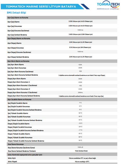 | Koruma | Aşırı şarj, deşarj, akım, sıcaklık, kısa devre |