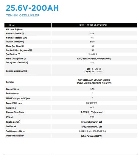 • 25.6V 200Ah yüksek kapasite (5120Wh)