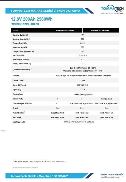 TommaTech Marine 12.8V 200Ah LiFePO4 Batarya, marin uygulamalar, karavan sistemleri ve off-grid enerji çözümleri için geliştirilmiş yüksek performanslı bir enerji depolama ürünüdür. ABS+PC dayanıklı kasa yapısı ve IP65 koruma seviyesi ile zorlu dış ortam koşullarında güvenli kullanım sunar.